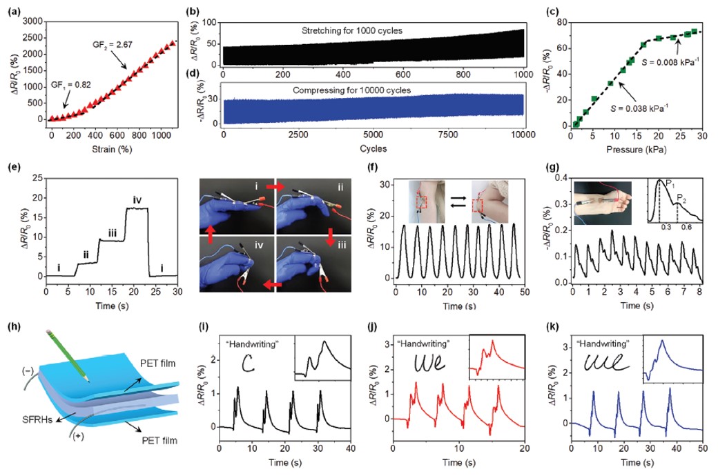 SFRHs在較寬的傳感范圍內具有較高的靈敏度和循環穩定性,可用于監測人體運動和脈搏跳動。SFRHs能夠有效監測復雜而微小的外界刺激,比如書寫字跡等等,這在字跡防偽等領域有重要的潛在應用價值。